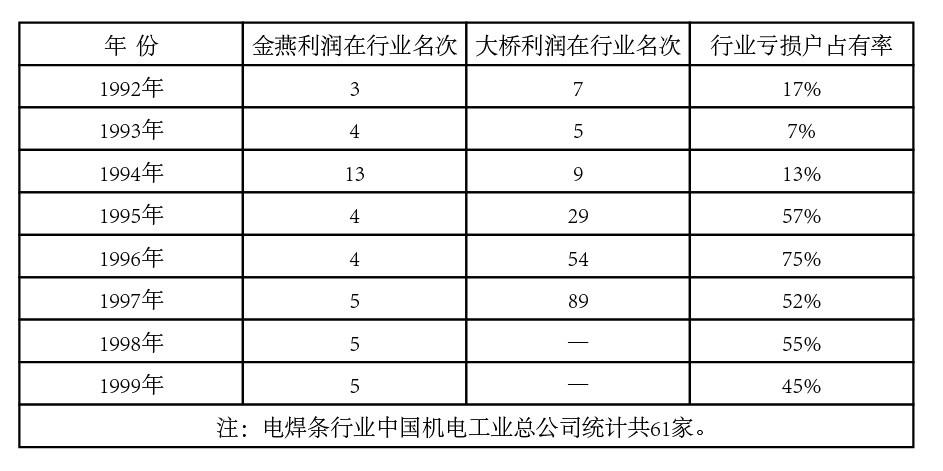 自1992年有了行业统计报表,金燕公司每年的利润总额在电焊条行业所排名次和大桥对比,以及行业亏损情况,请见表: